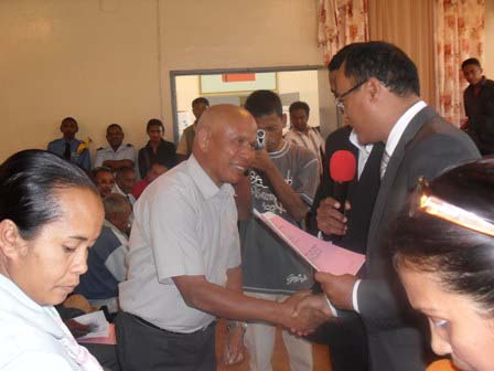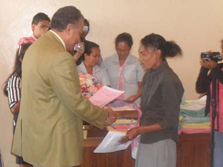 Le ministre de la décentralisation et de l’aménagement du territoire, Hajo Andrianainarivelo, a distribué 1 000 nouveaux titres fonciers ce jeudi 5 novembre 2009, au bureau du VIème arrondissement de la Commune Urbaine d’Antananarivo (CUA) à Ambohimanarina. Cette distribution entre dans le cadre d’une opération de délivrance de titres fonciers lancée depuis le mois de septembre dernier par le ministère. En tout 50 000 titres fonciers devraient être distribués dans tout Madagascar d’ici à la fin de l’année 2009, et 150 000 jusqu’en 2010.