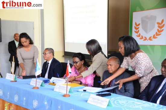 La communauté internationale conduite par le PNUD et la CENI en présence du ministre des Finances ont signé ce 20 février le document de projet « Soutien au cycle électoral de Madagascar » (SACEM). Ce projet en faveur du prochain cycle électoral bénéficie d’un portefeuille d’une valeur de 12 millions USD. Le SACEM couvre cinq (5) domaines : l’appui à la fiabilisation et la crédibilisation des listes électorales ; la révision du cadre légal relatif aux élections ; la communication, éducation civique et électorale ; l’appui aux opérations électorales ; l’assistance technique.