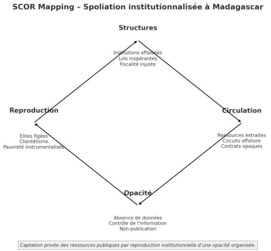 La grille SCOR (Structures, Circulation, Opacité, Reproduction) explique le fonctionnement de la spoliation. Les institutions sont affaiblies (S), les flux d’argent sont opaques (C), les décisions non publiées (O), et les postes-clés occupés par les mêmes familles (R).