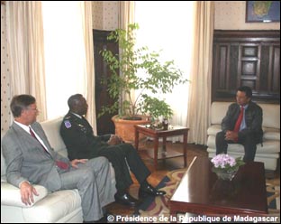 Le Président de la République, Marc Ravalomanana, a reçu en audience hier, au Palais d’Etat d’Ambohitsorohitra, les membres d’une délégation du Centre de Commandement des Etats-Unis pour l’Afrique, conduits par le Commandant Général, William E. (Kip) Ward, et l’Ambassadeur des Etats-Unis à Madagascar, Sem Niels Marquardt. L’entretien a porté sur le renforcement de la coopération militaire et la contribution du gouvernement américain à la préparation du Sommet de l’Union Africaine à Madagascar. Le Centre de Commandement militaire des Etats-Unis pour l’Afrique, AFRICOM, a pour mission de diriger des engagements sécuritaires soutenus et persistants avec les partenaires africains, axés sur des programmes visant à prévenir les conflits et à stimuler le dialogue et le développement continus. Dans ce sens, le Général William E. (Kip) Ward devait assurer au Président Ravalomanana « l’importance de la coopération avec Madagascar, compte tenu de sa position stratégique et réitérer la volonté des Etats-Unis à renforcer la capacité sécuritaire de Madagascar et de raffermir la coopération militaire bilatérale ».