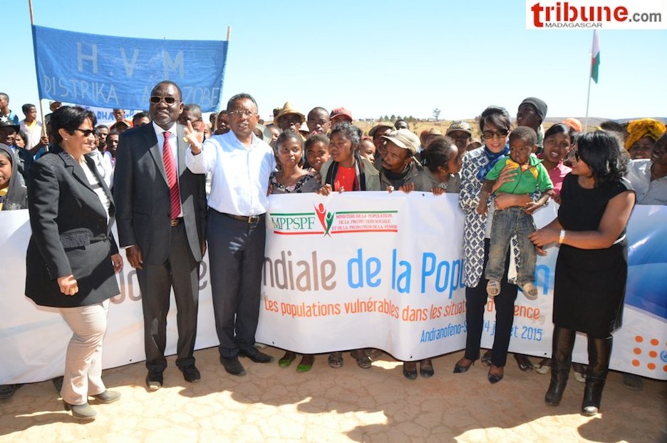 Le président de la République, accompagné de son épouse, a tenu à être présent à la célébration de la Journée mondiale pour la Population qui a eu lieu à Andranofeno Sud, dans le District d’Ankazobe ce 14 juillet 2015, afin de marquer son soutien à cette initiative qui vise au mieux être de la population défavorisée mais qui ne baisse pas les bras malgré les difficultés et les vicissitudes de la vie.