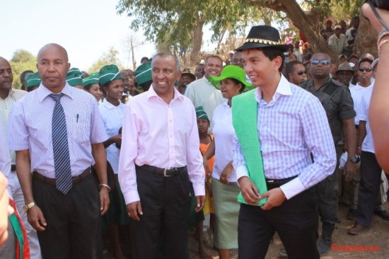 Le président de la Transition, Andry Rajoelina, a effectué ce vendredi 14 septembre 2012, une visite dans la commune rurale de Bevoay, district de Morombe, région Atsimo Andrefana. Il était accompagné du ministre des Finances et du Budget et du ministre de l’Agriculture. La presse destinée à couvrir l’événement en de pareille occasion pour sa part, a été conduite par le ministre de la Communication. Faisaient aussi partie du voyage, le représentant de la Banque africaine de développement (BAD) et le représentant de l’Union européenne à Madagascar. L’objet de cette lourde mission était de donner le coup d’envoi du projet de réaménagement des périmètres rizicoles du Bas Mangoky.