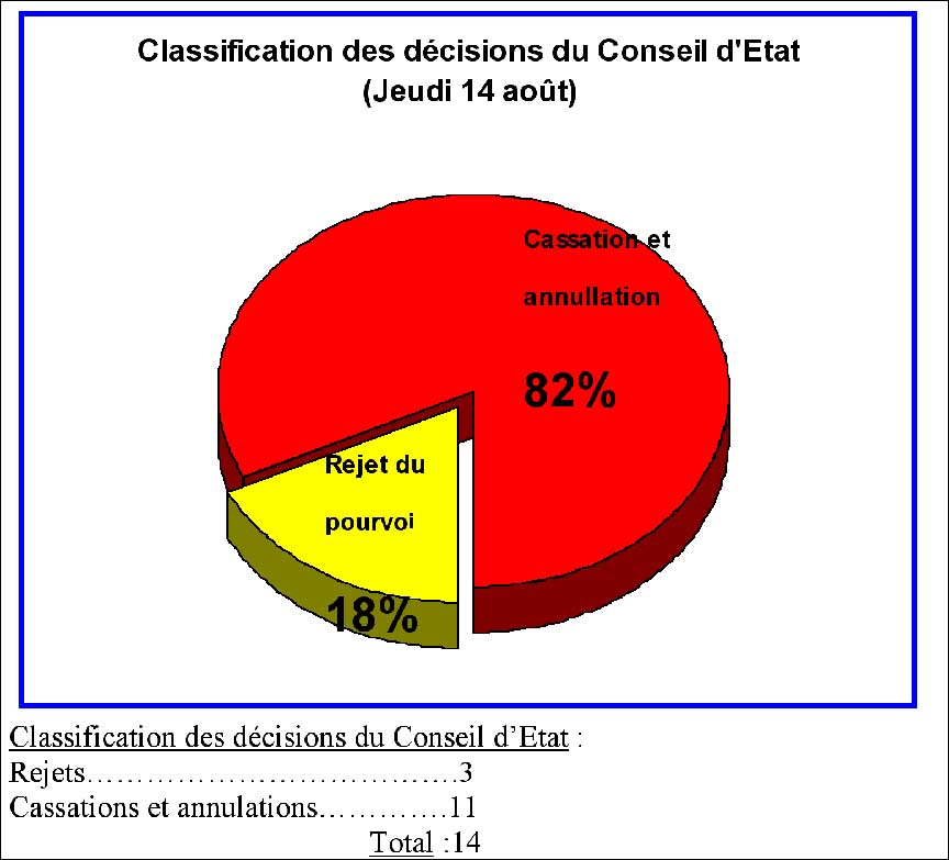 Sur les 14 décisions rendues par le Conseil d’Etat, jeudi dernier au palais de justice Anosy, 11 ont été des cassations et annulations, en tout ou partie, des décisions des tribunaux administratifs concernant l’élection municipale du 13 décembre 2007. Seul les trois premiers pourvois en cassation ont été rejetés. Il s’agit du pourvoi formulé par Rasoloarivony Raholiarilala, pour la Commune urbaine d’Antsohihy, région Sofia, du pourvoi formulé par Rabodonirina Haigomalala, Commune rurale Ambohimalaza, District Antananarivo Avaradrano, et enfin, le pourvoi formé par Yvon, pour la commune rurale Soavary, district Tolagnaro, région Anosy.