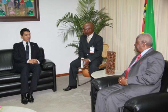 « Arrivés à Maputo (Mozambique) ce Mardi 19 Avril 2011 en milieu de la journée, le président de la Haute autorité de la transition, SEM Andry Nirina Rajoelina, et le Président du Congrès de la transition, SEM Raharinaivo Andrianantoandro, ont été reçus officiellement, à 18h (heure locale et à 19h à Madagascar), par le président de la République de Mozambique, SEM Armondo Emilio GUEBUZA.