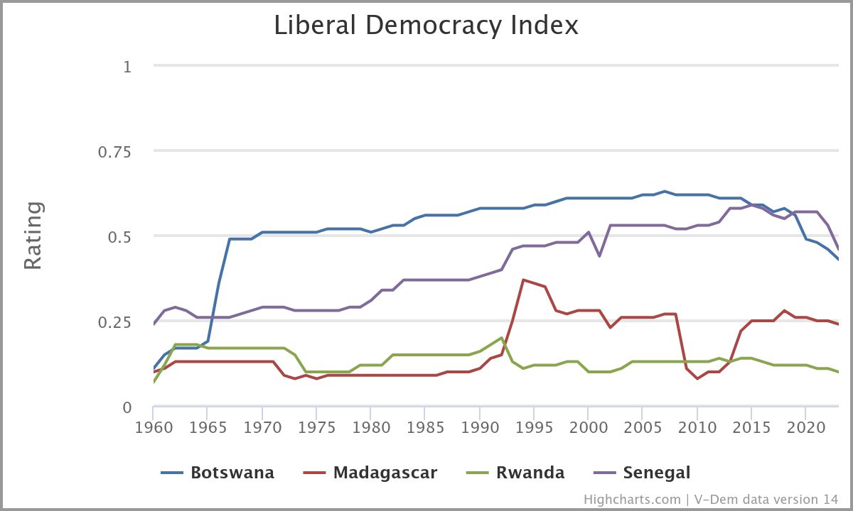 Nous n’allons pas tourner autour du pot. Selon tous les indicateurs faisant foi (Freedom House, Economist Intelligence Unit, projet V-Dem de l’Université de Gottenburg en Suède, Reporters sans Frontières etc.), Madagascar n’a jamais été une démocratie depuis 1960 jusqu’à ce jour. Il y a certes eu des moments meilleurs que d’autres, comme sous la Présidence du Professeur Zafy, tout comme il y a eu des moments pires que d’autres, comme sous les première et deuxième république, ou sous la Transition 2009-2013. Le graphique en bas d’article montre clairement les deux périodes « noires » durant lesquelles Madagascar plonge en dessous de 0,2 sur un indicateur allant de 0 à 1 : 1960-1992, et 2009-2013. Ce sont d’ailleurs les deux périodes de l’Histoire où le pays fait pire que le Rwanda. À titre de comparaison, la courbe du Botswana, une des démocraties les plus stables d’Afrique, ainsi que celle du Sénégal, ont été rajoutées. Seuls ceux qui sont assis sur leur sens critique vont soutenir qu’Andry Rajoelina est un champion de la démocratie, sous prétexte qu’il a inauguré la place éponyme, par ailleurs à usage unique comme les Kleenex.