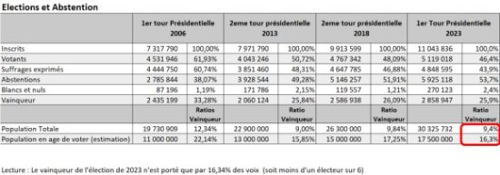 Parler de la légitimité du pouvoir c’est nécessairement revenir sur une analyse des chiffres bruts des dernières élections présidentielles. Ils nous donnent évidemment une grille de lecture factuelle de certaines des carences de notre système démocratique.