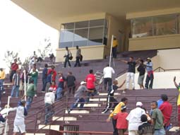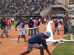 Une dizaine d’arrestations tel est le bilan non officiel de l’échauffourée de Mahamasina d’hier. La violence a gagné la foule quand aucun match n’a été joué au Stade municipal de Mahamasina. Les grilles de protection du terrain de foot ont fait les frais. Les chaises et les barres métalliques, voire les poteaux ont souffert de cette violence soudaine, expression de la colère juvénile. Apparemment, ces vandales sont constitués de jeunes qui sont (voir les photos en page 9) pour la plupart des mineurs.