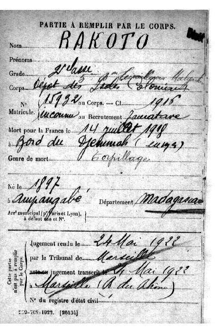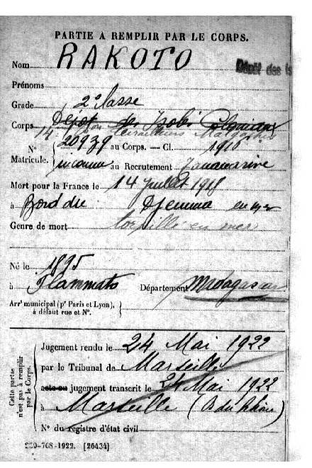 Le 14 juillet 1918, le navire Jemmah était torpillé. À son bord, un nombre important (mais que les archives de l’armée française ne permettent pas facilement de déterminer) de soldats malgaches.