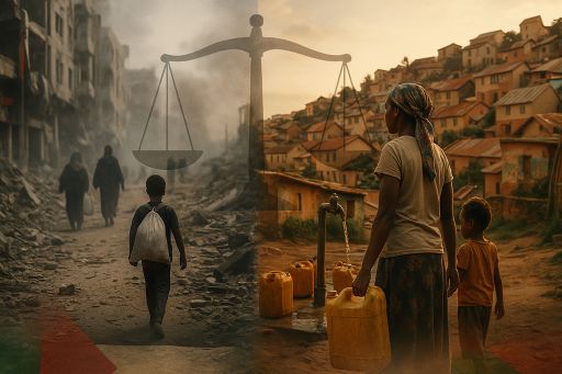 À Madagascar, c’est le droit à un minimum vital qui semble nié : le droit de manger à sa faim, d’apprendre, de se soigner, de construire une vie digne. Ici, pas de bombes, mais un abandon qui revient au même scandale : considérer certaines vies comme secondaires.