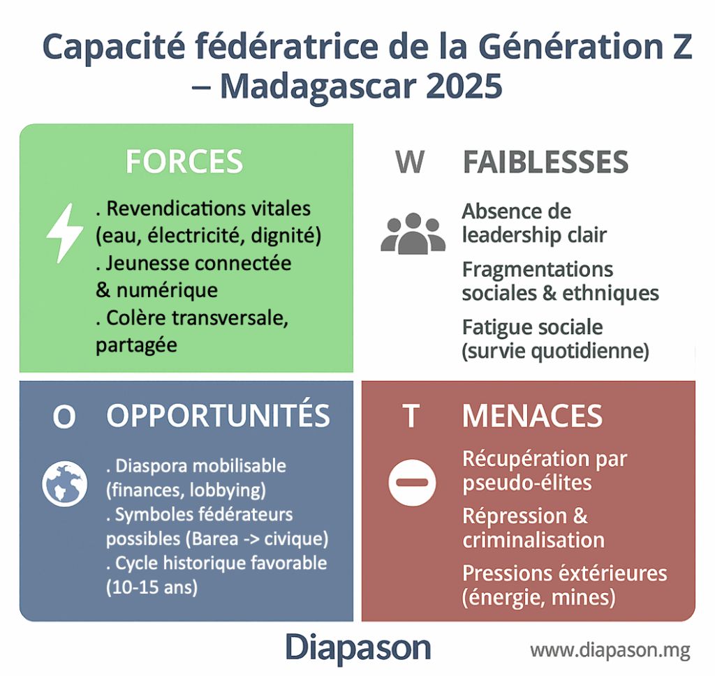 La diaspora dispose de ressources cognitives et de réseaux, mais elle perçoit parfois la séquence à travers un prisme médiatique et juridique décalé. La Gen Z Madagascar vit la contrainte quotidienne, la pression de sécurité et la fatigue. Le tempo, les risques et la grammaire de l’action divergent.