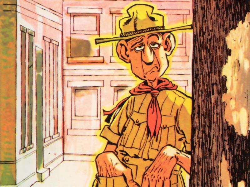 Désolé, mais je ne vois pas de boy-scouts dans ce tableau qui se veut champêtre. J’essaye quand même, mais c’est trop dur, il n’y a que vautours, chasseurs de primes et croque-mort qui rôdent attendant le crépuscule des porte-flingues promis à la potence de la vindicte populaire.
