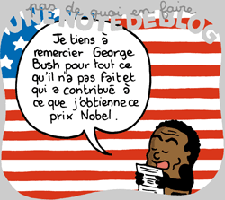 En prenant en compte la candidature de Barack Obama alors qu’au moment des nominations, celui-ci n’était occupant de la Maison Blanche que depuis onze jours, le comité Nobel crée une quatrième catégorie, et l’on se demande si l’on a affaire au Prix Nobel de la Paix ou à celui de Littérature. Le président américain a manifesté sa volonté de ne pas trop s’enfermer sur les problèmes de son propre pays et il semble avoir une vision d’un ordre mondial basé sur l’écoute et la discussion, mais il n’a pas fait pour l’instant avancer un seul traité majeur, et l’on attend encore la véritable concrétisation en actions des sommets du G20.