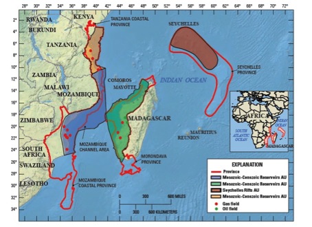 L’US Geological Survey a remis au président Obama en Avril 2012 un rapport stratégique qui évalue les réserves en énergies fossiles de 4 nouvelles « provinces » énergétiques dans l’Océan Indien : la côte tanzanienne, la côte mozambicaine, les Seychelles, la côte ouest malgache (Morondava Basin).