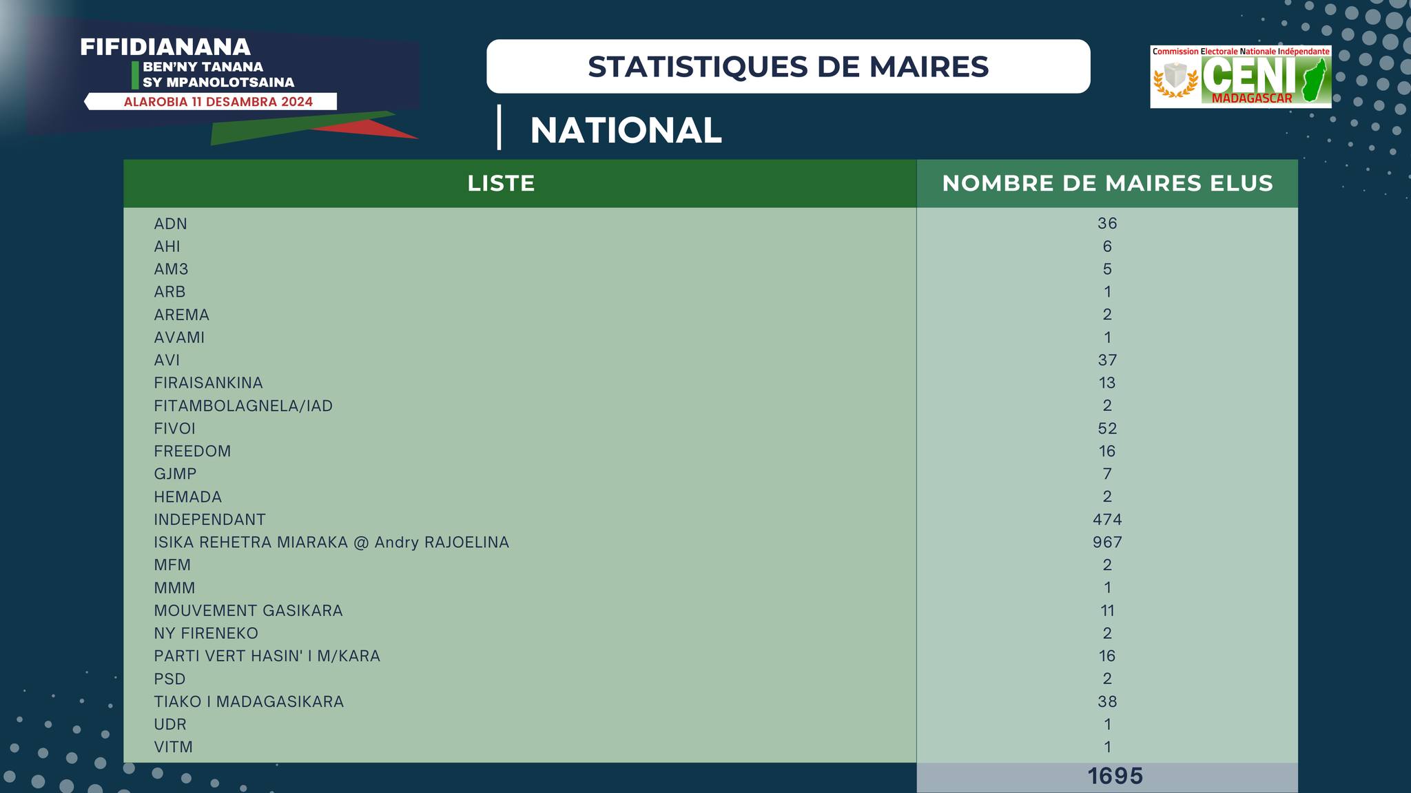 Sur les 1 695 sièges de maires à pourvoir, l’IRMAR a obtenu 967 sièges, soit près de 57% des mairies à travers l’ensemble du pays. Dans la province de Fianarantsoa, le parti présidentiel a même raflé 272 mairies. De leur côté, les candidats indépendants ont réussi à s’imposer dans 475 communes, dont 128 dans la région de Fianarantsoa. Les autres partis politiques, principalement issus de l’opposition, partagent les 253 sièges restants.