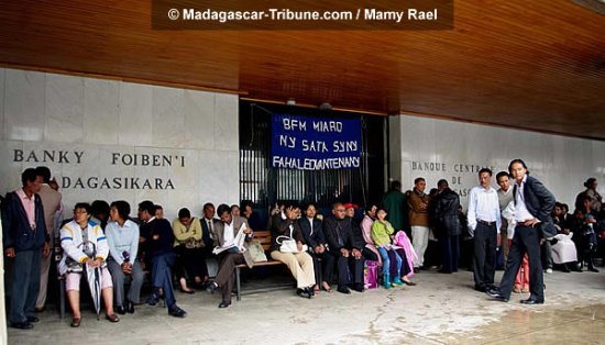 Aucun paiement dans les banques primaires dans la matinée de ce mardi 7 avril 2009 parce que les employés de la Banque centrale de Madagascar (BCM) ont observé une grève générale. Selon les employés qui ont tenu un sit-in devant les locaux de la BCM à Antaninarenina, et comme inscrit sur leur banderole, il s’agit de défendre le statut et l’indépendance de la BCM.