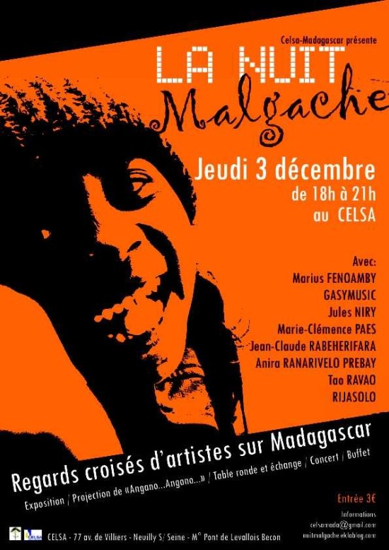 Après une exposition de photographies et d’oeuvres de différents artistes contemporains malgaches et africains, et la projection d’un moyen métrage (« Angano...angano... », réalisé par Marie-Clémence et César Paes ), Celsa-Madagascar vous propose d’assister à une table ronde animée par diverses personnalités qui viendront nous faire partager leur vision de la Grande Île. Enfin, un concert clôturera la soirée en beauté, avec une dégustation de spécialités culinaires malgaches !