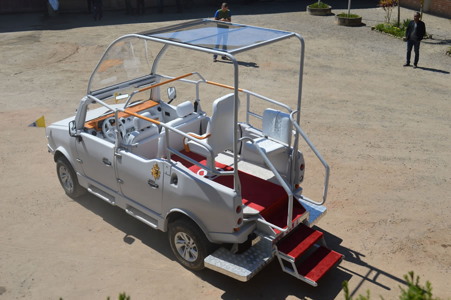 Ce sera à bord d’une « Karenjy » bien aménagée que le Pape François effectuera ses déplacements à Antananarivo dans le cadre de sa visite apostolique dans le pays à partir de la semaine prochaine. La présentation de cette Papemobile malgache a eu lieu hier, par le comité d’organisation de cette visite du Saint-Père. Il s’agit du modèle « Mazana II » de cette marque au zébu. La même marque que Pape Jean-Paul II avait utilisé trente ans plus tôt.