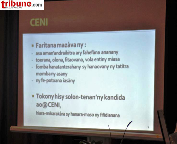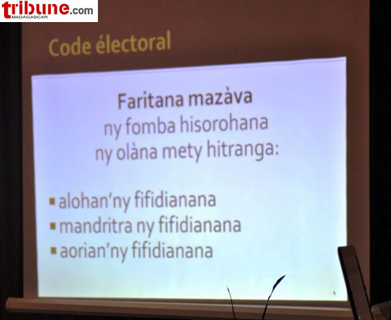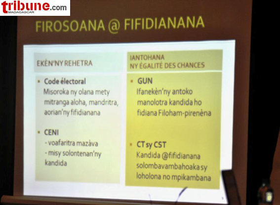 Le Pr Blanche Nirina Richard avait été la dernière à intervenir parmi les trois invités lors de la conférence-débat du samedi 5 mars dernier au Centre Arupe de l’EKAR Faravohitra. Elle a expliqué en près de 15 minutes seulement, slides à l’appui (voir le diaporama) qu’il faut assurer l’égalité des chances à tous ceux qui se portent candidat à n’importe quelle élection.