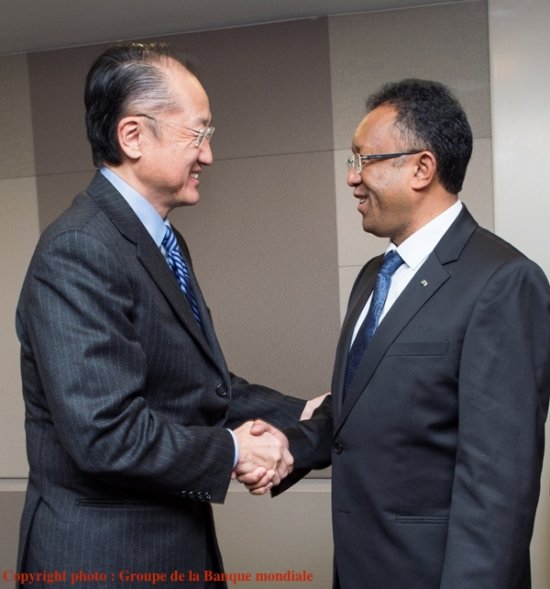 Le Président Hery Rajaonarimampianina a rencontré le 18 mars 2014 à Washington D.C. le président du Groupe de la Banque mondiale, le Dr Jim Kim. Le Chef de l’État malgache a souligné son appréciation du travail effectué par cette institution à Madagascar pendant la crise, et a exprimé ses remerciements pour la récente approbation d’un financement d’urgence dans les domaines de la sécurité alimentaire et de la nutrition. Il a sollicité l’appui de la Banque mondiale pour aider Madagascar à relever les défis cruciaux qui se présentent.