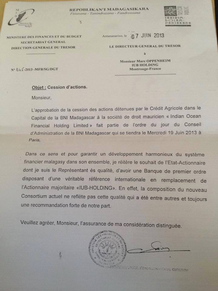 Le problème pour Andry Rajoelina est que les preuves de cette opposition ont déjà été révélées par les médias, et notamment par le présent site et par le site de la mouvance Ravalomanana. Pour la gouverne de nos gouvernants, voici donc le facsimilé d’une lettre du directeur général du Trésor marquant clairement son opposition à la cession projetée. Et si d’aventure Andry Rajoelina pensait que Hery Rajaonarimampianina ne serait jamais intervenu dans ce dossier, il n’aura qu’à lire cette lettre signée par le ministre lui-même.