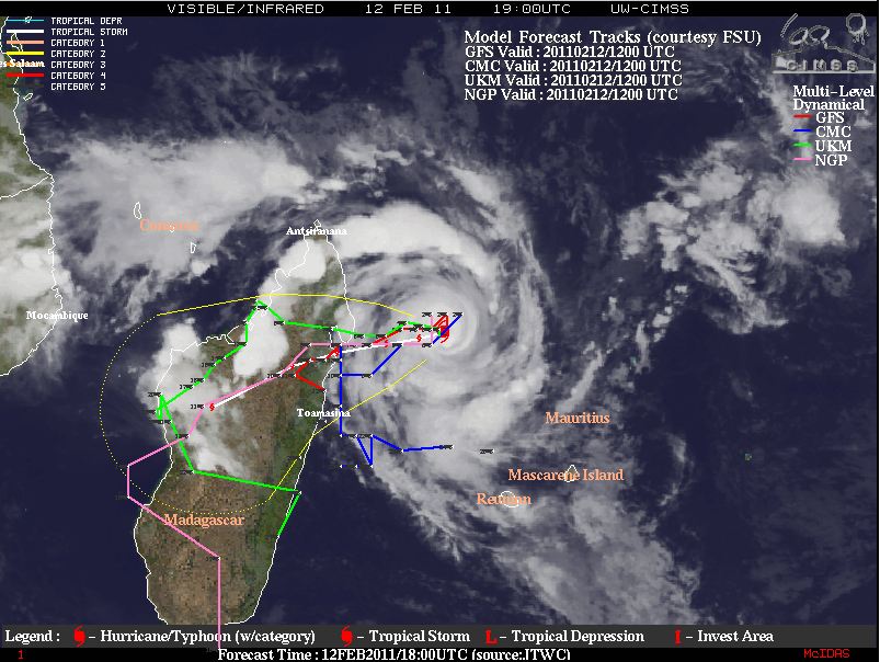 Les différents modèles de prévisions envisagent toujours un cap vers l’ouest, sud-ouest, se dirigeant vers la côte Est de Madagascar. Un atterrissage entre la presqu’île de Masaola et l’île Sainte Marie semble être inévitable lors de la journée du lundi 14 février.
