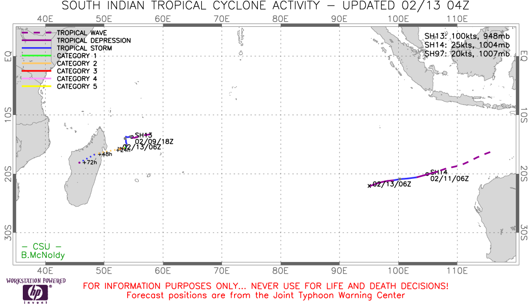 Ses déplacements sont toujours erratiques et sa position très peu évolutive. Il se situe actuellement à quelque 300 km des côtes malgaches.