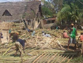Les murs traditionnels sont ainsi confectionnés avec des panneaux de lattes de bambous tressés suivant des textures diverses. En brousse, les familles construisent elles-mêmes leur case, en principe avec le coup de main des hommes du clan, selon la règle de l’entraide traditionnelle. Ils tressent donc eux-mêmes les bambous nécessaires qu’ils obtiennent en se servant directement dans la nature car les plantations sont généralement spontanées et n’appartiennent à personne. En ville, aujourd’hui, une myriade de PMI artisanales fonctionnent à base de bambou essentiellement assemblé en panneaux tressés pré fabriqués, de différents formats. Le format standard fait 2 m de haut sur une longueur sur commande pouvant aller jusqu’à 10 ou 12 m