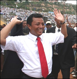 Mais il est pire que Ratsiraka : enrichissement personnel galopant ;nombre d’entreprises lui appartenant en peu de temps ; menteur car le peuple est plus pauvre qu’il y a 9 ans( j’ai pu le constater ) ;capricieux à vouloir à tout prix son petit jouet d’avion ;les malgaches ne croient plus en lui et ça se comprend, nous ferions la même chose. De plus les ressemblances avec Sarkozy , sur plusieurs points est allucinante !!!Courage ,beaucoup de citoyens de quelques pays que ce soit vous regardent et prient tous les jours pour qu’enfin LA DEMOCRATIE, la VRAIE, naisse dans L’ESPOIR ,DANS L’AVENIR de ce merveilleux pays .