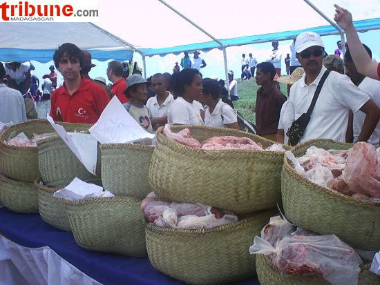 À l’occasion de la célébration de la fin du Ramadan, l’ambassade de la Turquie à Madagascar a procédé depuis ce dimanche 6 novembre, en collaboration avec les responsables de la ville d’Antananarivo, à la distribution de 200 zébus pour la population tananarivienne, précisément à 8 000 toits de la ville d’Antananarivo ce dimanche 06 et lundi 07 Novembre 2011. Il s’agit selon le PDS de la ville, Edgard Razafindaravahy, de renouer avec une valeur importante de la culture malgache : « le nofon-kena mitam-pihavanana » pour marquer la solidarité et l’union de la population. Ce fut ce matin du 6 novembre à l’abattoir d’Ankadintratombo et au terrain d’Andohatapenaka. 33 tonnes de viande sont offerts par ces Turcs et la distribution se poursuit ce jour dans les trois autres arrondisements qui n’ont pu être couverts dimanche.