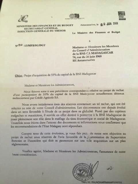 Dans le cas qui se présente, si quelques parties impliquées dans l’affaire ont observé une attitude changeante (voir doc photo 1 : lettre au conseil d’administration de la BNI en date du 20 juin 2013) sans que des faits pertinents nouveaux sont apparus, le directeur général du Trésor en tant que membre de la CSBF, a toujours parlé un seul langage (voir doc photo 2 : lettre en date du 7 juin 2013). La seconde réunion de la CSBF a décidé autrement en son absence. Mais cette seconde réunion a aussi été qualifiée par Serge Zafimahova de truffée d’irrégularités et de ne pas avoir rempli les conditions légales (voir mémo BNI Conseil d’Etat). Les preuves demandées par le président de la Transition sont déjà parues dans les médias.