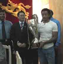 Mamisoa Razafindrakoto recevant des mains du ministre des Sports mauricien, le trophée symbolisant la victoire malgache.