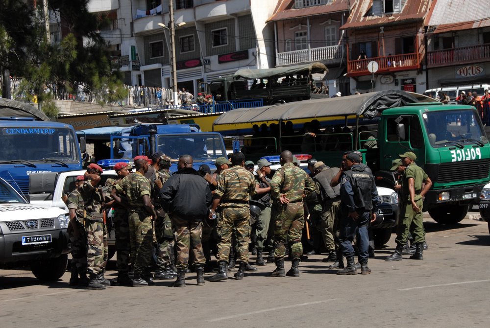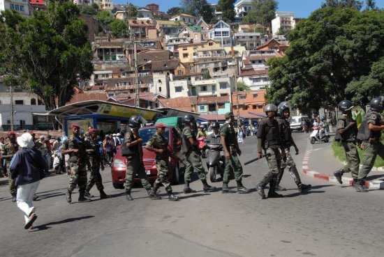 Dans le même temps, les forces de l’ordre déployaient petit à petit l’ensemble de leur dispositif : une dizaine de camions remplis de troupes anti-émeutes, des pick-ups patrouillant dans tout le centre-ville (y compris les nouveaux Nissan marqués « Emmo Sécurité » remis officiellement la veille par le Président de la Transition), et des patrouilles à pied tout autour du jardin d’Ambohijatovo.