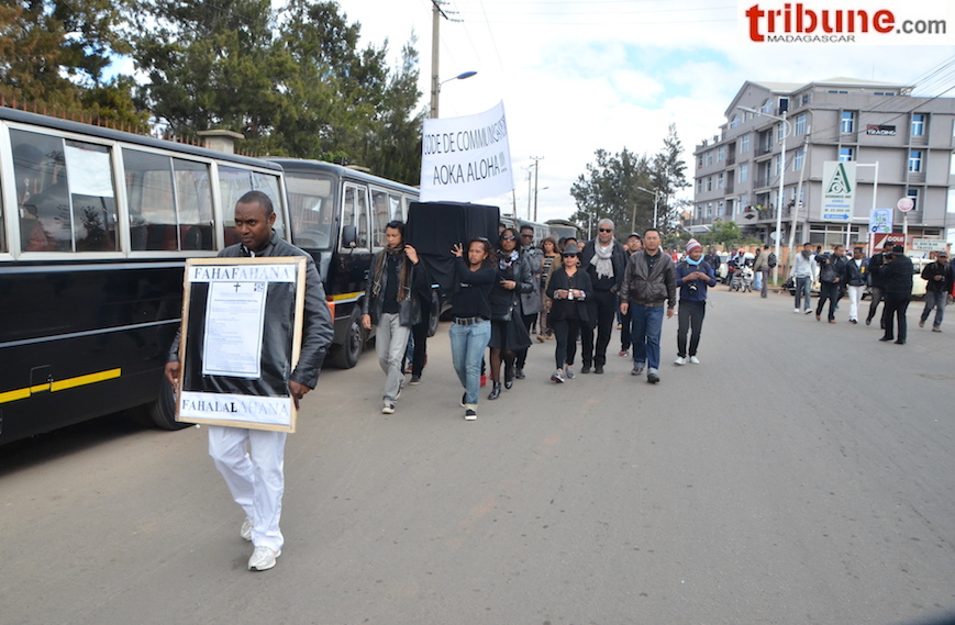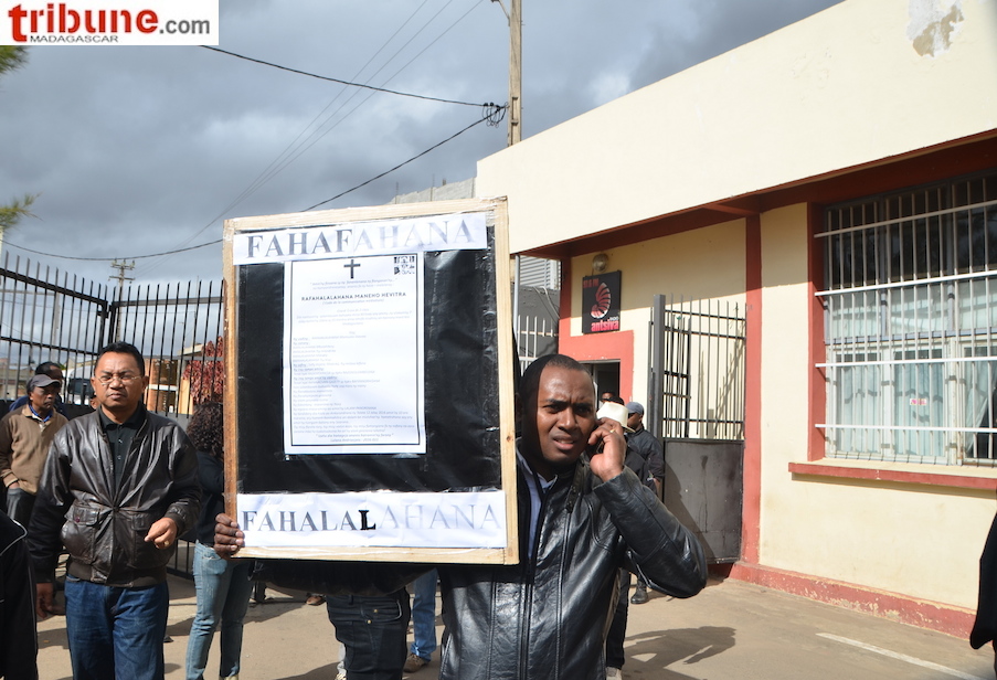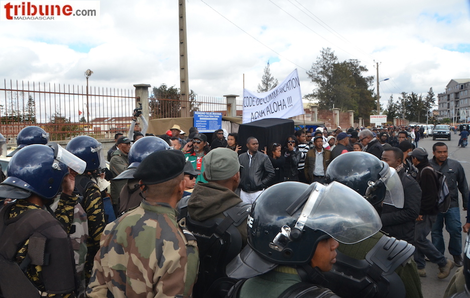Les leaders du mouvement pour la liberté d’expression ont discuté et essayé de persuader les éléments des forces de l’ordre pour qu’ils puissent effectuer la marche pacifique prévue se dérouler entre 10h et 12h ce 12 juillet 2016, mais en vain. Cette marche devait partir d’Ankorondrano pour rejoindre la stèle de la liberté de presse à Soarano-Anlakely pour y « enterrer » la liberté de presse et d’expression. Mais au désespoir des sympathisants du mouvement, et au grand étonnement des riverains et des habitués du « Village des Jeux » à Ankorondrano dont la circulation a été très perturbée, très tôt dans la journée, des éléments des forces de l’ordre ont verrouillé le site. Confinés dans la ruelle du « Village des jeux », les manifestants se sont résignés à annuler la marche pacifique parce que d’après Fetra Rakotondrasoa, le porte parole du mouvement, les forces de l’ordre déclarent avoir détecté des casseurs sur le trajet jusqu’à Analakely. Aussi, pour préserver le caractère pacifique du mouvement, les leaders du mouvement ont informé leurs sympathisants que la marche funèbre est annulée, l’enterrement de la liberté d’expression ne peut avoir lieu.