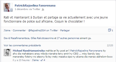 Et comme ça ne suffisait peut-être pas, il a encore sorti un post il y a quelques jours où il est allé raconter des histoires d’alcôve, mettant à profit son tempérament de mouchard. On est sûr que ce qu’il dit est faux. Mais même si c’était vrai, les Malgaches s’en moquent car la polygamie officielle ou officieuse est une seconde nature chez beaucoup de Malgaches. Et toi, qu’en penses-tu, Patrick ?