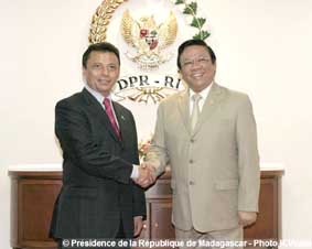 Le Chef de l’Etat a également rappelé les liens historiques qui unissent l’Indonésie à Madagascar. La nécessité d’établir une collaboration plus étroite dans le contexte de la globalisation, est aujourd’hui d’autant plus grande et la promotion de la coopération Sud-Sud est, d’après le Chef de l’Etat, sollicitée pour mieux affronter les phénomènes mondiaux à l’instar de la précédente crise financière. Le Président Ravalomanana a poursuivi en appelant au développement des échanges commerciaux, et à la conjugaison des complémentarités, invitant par l’occasion, les opérateurs indonésiens à venir investir à Madagascar, mais aussi les autorités gouvernementales indonésiennes, à commencer par le Président Dr Susilo Bambang Yudhoyono. La Grande Ile, dans sa politique de développement adoptée par l’Etat à travers le MAP, est déterminée à aller de l’avant et est ouverte dans cette perspective aux partenariats en faveur d’une croissance économique réciproque.