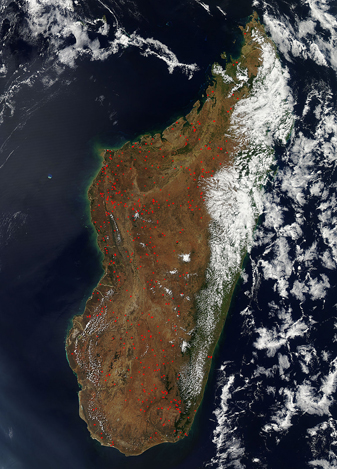 Des points rouges sur toute la partie ouest de Madagascar ; il s’agit de localisation des feux de brousses établis par le « Moderate Resolution Imaging Spectroradiometer (MODIS) » ou spectroradiomètre imageur à résolution modérée de la National Aeronautics and Space Administration (NASA) des américains, à bord du satellite Aqua qui a acquis cette image en vraies couleurs le 10 septembre 2012.