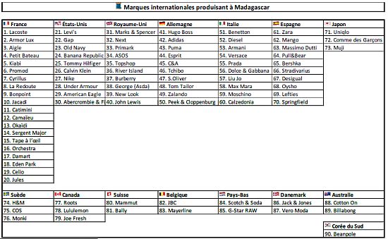 Des polos Petit Bateau aux jeans Levi’s, ce sont plus de 90 marques internationales qui font produire leurs collections à Madagascar [1]. France, Allemagne, Italie, Japon… toutes les grandes nations du textile y délocalisent leur confection. La qualité du savoir-faire malgache, la main- d’œuvre qualifiée, les coûts compétitifs et un cadre fiscal favorable attirent.