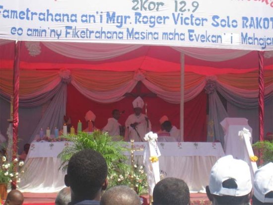 Une immense foule de fidèles catholiques de la ville de Mahajanga et de la périphérie a assisté ce matin du dimanche 11 Avril 2010 à la grande messe devant la Cathédrale de Mahajanga Be pour l’intronisation de Monseigneur Roger Victor Solo Rakotondrajao en qualité d’évêque du diocèse de l’ex-province de Mahajanga. Plusieurs invités honorables civils et militaires étaient également conviés à cette cérémonie religieuse ; notons entre autre la présence du vice Premier Ministre chargé de la santé Alain Tehandrazanarivelo, celle du ministre de l’enseignement supérieur, Athanase Tongavelo, et celles du nonce apostolique et de l’ambassadeur du Sénégal. À leurs côtés se trouvaient le chef de la région Boeny, un fervent catholique, Rasoloniaina Jean Christophe Noël, entouré du chef de district de Mahajanga I Feno Georges et du maire de la Commune urbaine de Mahajanga, Dr Randriarimanana Jean Nirina.