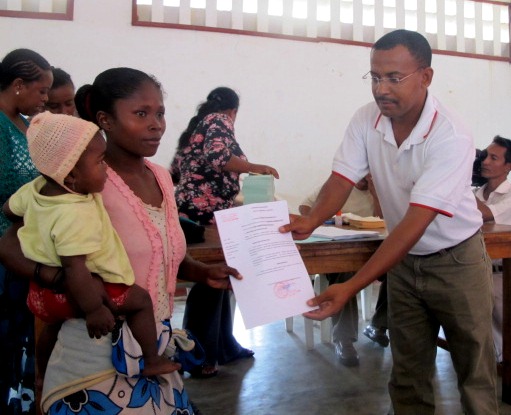 Le village de relocalisation d’Ambatovy à Vohitrambato, Toamasina II, a abrité ce lundi 12 novembre 2012 un double événement : la délivrance de 335 actes de naissances et jugements supplétifs à des enfants et adultes et le lancement de l’opération Carte d’identité nationale. Il s’agit pour Ambatovy, en tant qu’entreprise citoyenne et responsable de manifester son engagement à concrétiser le plan de développement social dans sa rubrique « aider les gens à obtenir leurs pièces d’identité ». « Tout citoyen a droit à l’acte de naissance indispensable non seulement pour accéder à des services publics et au vote mais il constitue surtout un droit fondamental pour le bien-être de la personne », a déclaré le directeur de l’Engagement Social, Ben Chapman.