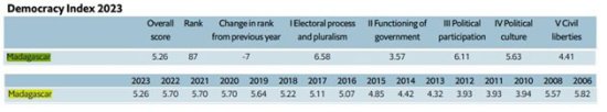 En 2022, la notation pour Madagascar était de 5.7 et en 2023, la notation était de 5.26 : il y a donc un écart de 0.44 ; cet écart s’explique par les dernières élections qui ont eu lieu en 2023. Madagascar reste en tout état de cause le 5e pays le plus pauvre du monde quel que soit l’indice de sa démocratie.