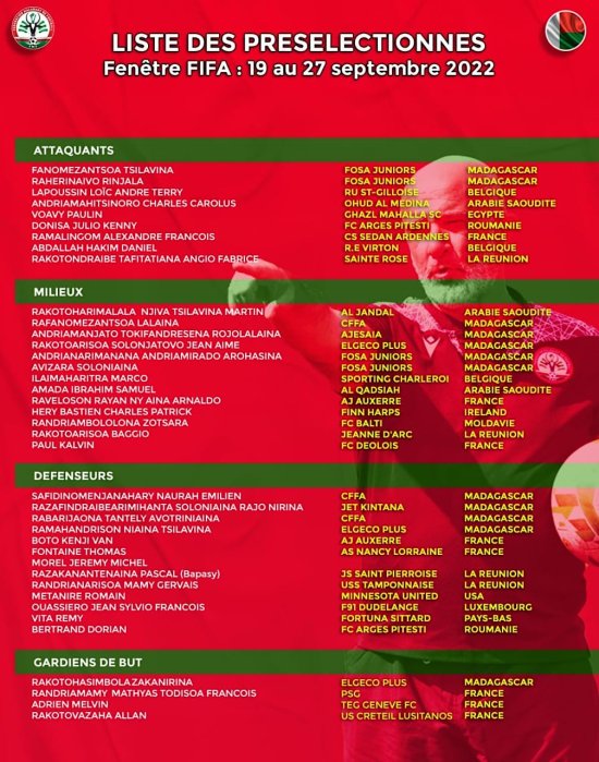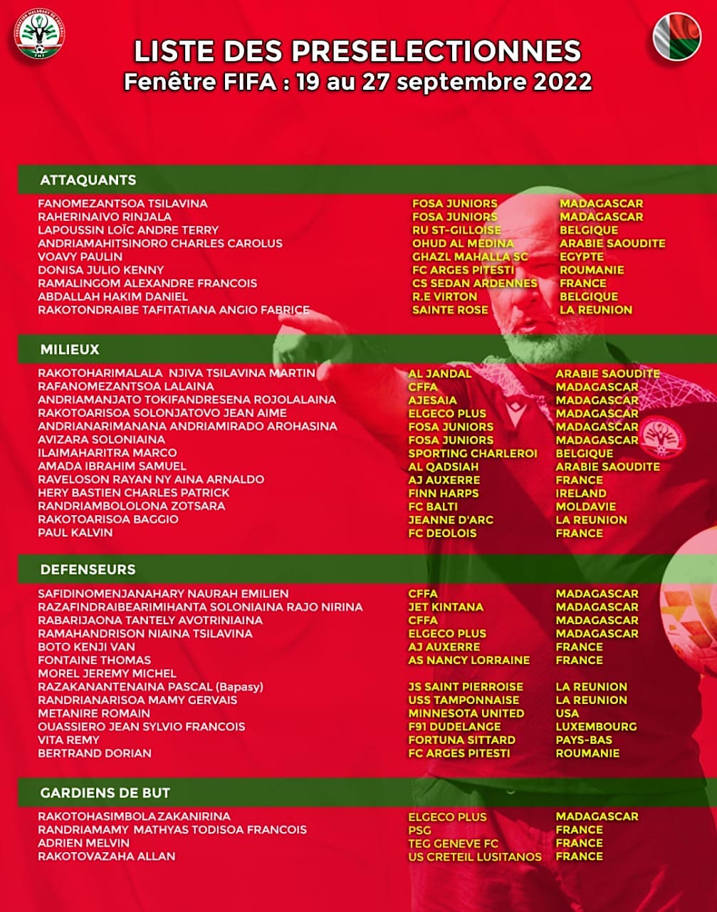 Outre les cadres habituels, le sélectionneur français de l’équipe nationale malagasy a fait appel à de nouveaux joueurs à l’instar d’Allan Rakotovazaha de l’US Créteil Lusitanos et du jeune milieu de terrain de FC Deolois Kalvin Paul, qui a évolué jusqu’ici avec les Barea U23.Comme annoncé il y a quelques semaines, Rémy Vita de FC Sittar aux Pays Bas et Kenji Van Boto d’Auxerre sont aussi convoqués.