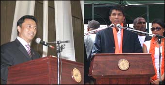 Le maire de la Commune Urbaine d’Antananarivo (CUA), Andry Rajoelina, et le Chef de l’Etat, Marc Ravalomanana, ont utilisé le même pupitre, samedi et dimanche dernier. En neffet, il y a trop de ressemblance entre le pupitre utilisé par la Commune Urbaine d’Antananarivo, samedi dernier sur la place de la démocratie à Ambohijatovo, et celui utilisé par la FJKM, dimanche dernier au palais des sports et de la culture à Mahamasina. Un pupitre de couleur marron, orné d’un emblème rond de couleur jaune, aux contours marron. Le temple FJKM y a organisé un culte à l’occasion du nouvel An et pour accompagner en prière le président du FJKM, le pasteur Lala Rasendrahasina, dans les travaux qui l’attendent pour cette nouvelle annnée. Le président de la République et son épouse, accompagné des membres du gouvernement, ont honoré de leur présence cet évènement cultuel. Le Chef de l’Etat Marc Ravalomanana a pris la parole durant la cérémonie. Il a ainsi fait usage de ce pupitre.
