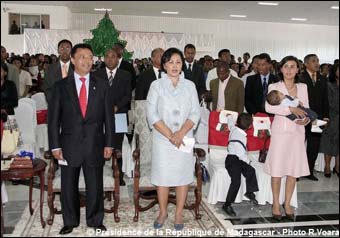 Emotion parmi le personnel de la présidence de la République, à la Ceremony Builing, en voyant le chef de l’Etat accompagné de sa belle fille, Georgena Georgeiva et de ses deux petits fils, mercredi dernier lors de la célébration de Noël,. La journée a commencé par un culte dirigé par l’Aumônier militaire, le pasteur Rakotozafy Mickaël et l’Aumônier, P. Randriamampianina Nicolas. 150 enfants ont animé la scène. « Ils sont dignes d’être les premiers du fait des talents dont ils ont fait preuve aujourd’hui », s’est réjoui Ravalomanana Marc. Le locataire d’Ambohitsirohitra a été tellement satisfait de la cérémonie qu’il a affirmé devant le personnel de la présidence que « Madagascar peut se comparer avec les autres pays ». Le directeur de cabinet de la présidence de la République, Ratsirarson Joelisoa, a de son côté annoncé que « cette cérémonie montre l’amour du président pour les enfants ». La Présidence a distribué des jouets, des bonbons, des volailles et de l’huile pour ses agents.