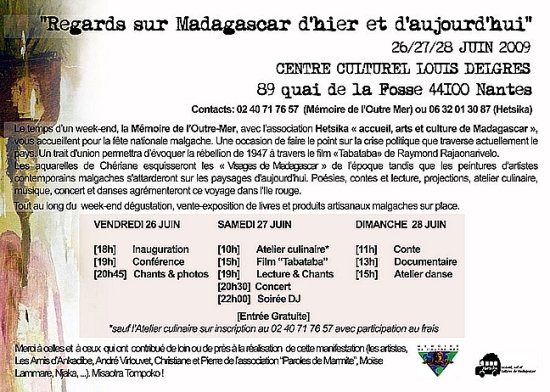 Le temps d’un week-end, Mémoire de l’Outre-Mer, avec l’association Hetsika « accueil, arts et culture de Madagascar » , vous accueille pour la fête nationale malgache, à l’Espace Culturel Louis Delgrès . Une occasion de faire le point sur la crise politique que traverse actuellement le pays. Un trait d’union permettra d’évoquer la rébellion de 1947 à travers le film « Tabataba » de Raymond Rajaoanarivelo.