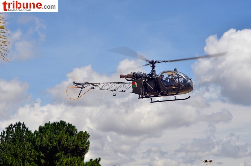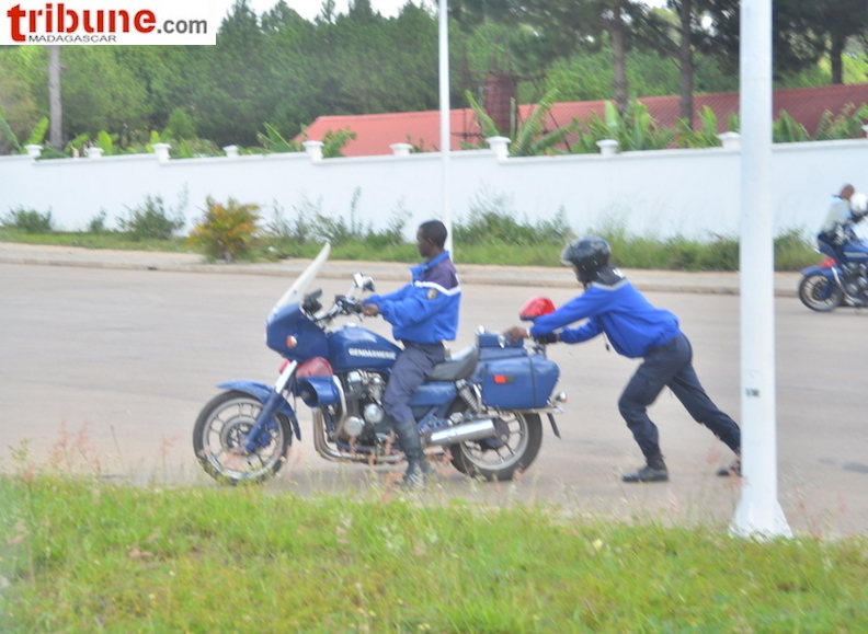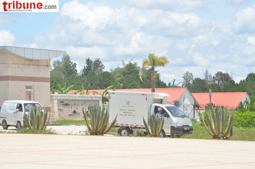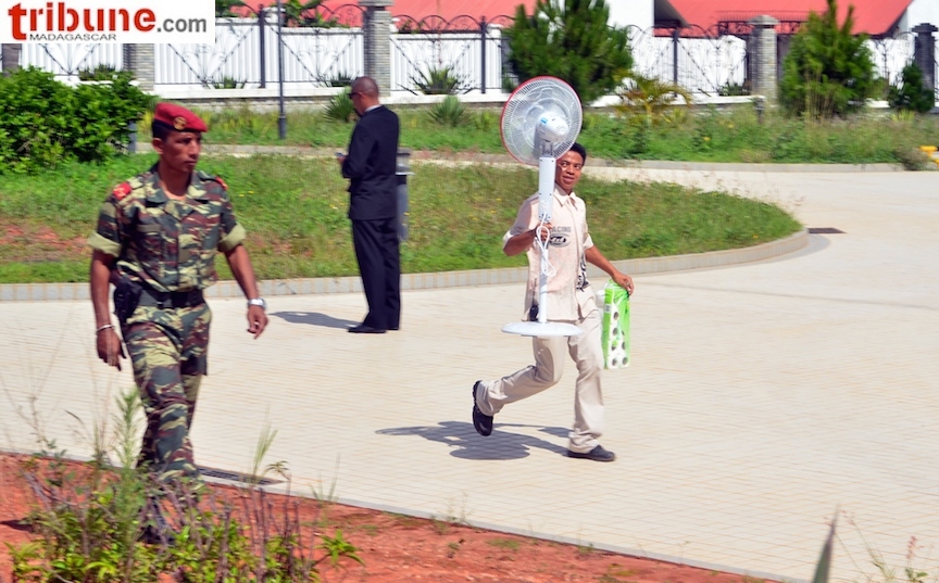 1 hélicoptère, 1 moto avec batterie à plat, 3 ventilateurs manifestement ils avaient rétabli le jus à moins que le groupe électrogène eusse été rempli de benzine : pour rafraichir l’ atmosphère qui devait etre assez mahafana pour faire griller quelques journaleux, mais qui n’ ont pas été invités au festin ...