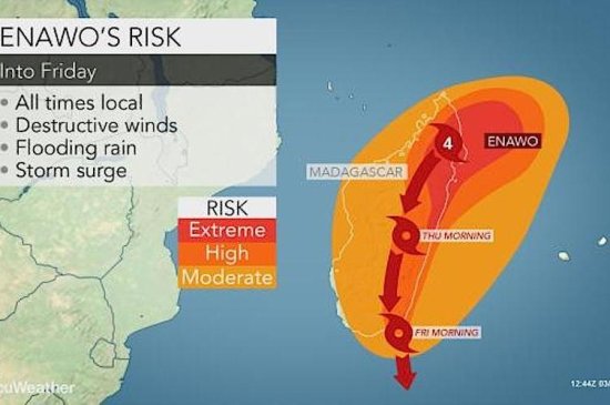 Le cyclone tropical Enawo est au centre de l’actualité depuis ce 7 mars 2017. Enawo qui touche près de 80% du pays, a fait dès son entrée en terre ferme trois (3) morts, dont un enfant à Maroantsetra et deux adultes à Mananara Nord. En raison de cette catastrophe et de la menace qui pèse sur la nation, l’Etat a décidé d’annuler toutes les festivités se rapportant à la célébration de la journée internationale des femmes dans le pays ; c’est ce que la presse qui rapporte les visites du président de la République accompagné par le chef du gouvernement auprès du Bureau national de gestion des risques et catastrophes (BNGRC) et sur le site d’hébergement au gymnase couvert d’Ankorondrano, fait part. En tout cas, l’alerte rouge est effective dans la région Analamanga et dans la capitale. Tous les établissements scolaires sont fermés.