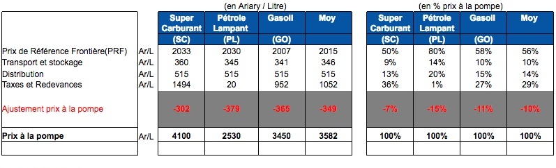 La vérité des prix était prévu être atteinte en octobre 2018 selon les informations sur le site le l’Office Malgache des Hydrocarbures mais au mois d’août, les prix sont encore situés à -440Ar/L en dessous de cette vérité des prix. Le prix actuel du super carburant est de 4150 Ar/L et le gazoil de 3500Ar/L.