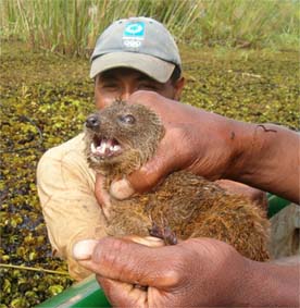 Fidimalala Bruno Ralainasolo, le biologiste de la conservation travaillant pour Durrell Wildlife Conservation Trust qui a le premier capturé le nouveau carnivore, a déclaré : « Nous savions depuis un certain temps qu’un carnivore vivait dans les marais du lac Alaotra, mais nous avions toujours supposé que c’était un Vontsira à queue brune que l’on retrouve aussi dans les forêts tropicales de l’Est. Toutefois, les différences dans le crâne, les dents, et les pattes ont montré que cet animal est clairement d’une espèce différente, avec des adaptations à la vie en milieu aquatique. C’est une découverte très excitante et nous avons décidé d’honorer le fondateur de notre organisation, le célèbre écologiste Gerald Durrell, en nommant de son nom cette nouvelle espèce. Toutefois, l’avenir de l’espèce est très incertain car les marais du Lac Alaotra sont extrêmement menacés par l’expansion agricole, les incendies, les plantes et poissons envahissants. C’est un site très important pour la faune et les ressources que celle-ci offre aux gens, et Durrell Wildlife Conservation Trust travaille en étroite collaboration avec les communautés locales pour assurer sa utilisation durable et préserver le Vontsira Durrell et d’autres espèces importantes ».