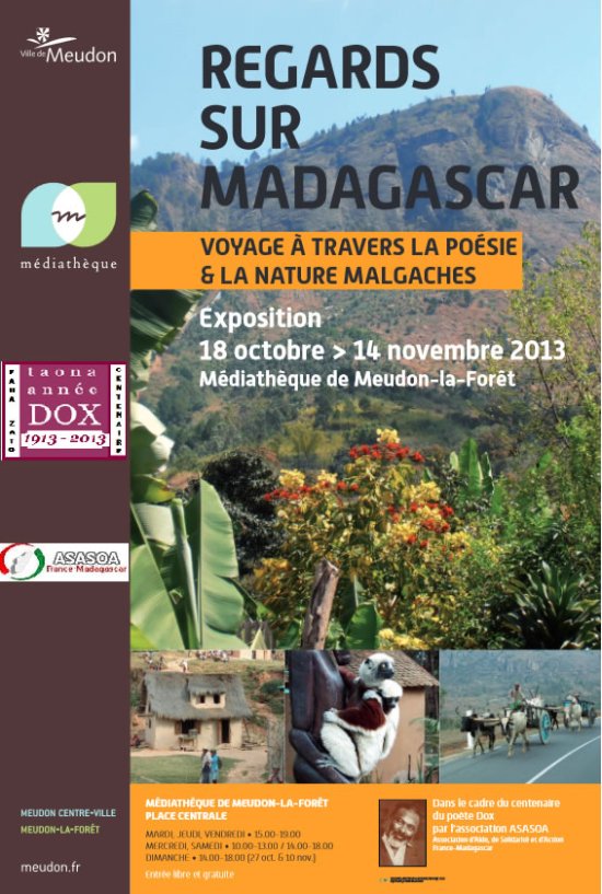 Dans le cadre de la célébration du centenaire du poète malgache Dox (1913-1978), grande figure de la littérature malgache et francophone, la municipalité de Meudon organise avec l’association ASASOA (Association d’Aide, de Solidarité et d’Action) France-Madagascar et les descendants de Dox une exposition sur la biodiversité et la poésie malgaches « Regards sur Madagascar : découvrir Madagascar à travers la poésie, les mots sont notre guide ». Des œuvres de peintres internationaux inspirées par les poèmes de DOX y seront exposées.